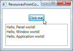 Bemærk hvordan vi bruger FindResource() metoden på forskellige områder - først på panelet, derefter på vinduet og endelig på det nuværende Application object. Det giver mening at lede efter ressourcen der, hvor vi ved den er, men som tidligere nævnt søges opad i hierarkiet, hvis en ressource ikke bliver fundet. Så i princippet kunne vi have brugt FindResource() metoden på panelet i alle tre tilfælde eftersom den ville have fortsat op til vinduet og derefter til applikationsniveau, hvis ikke fundet.