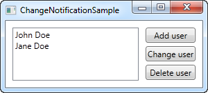 In the final example, which you will find below, we have simply replaced the List<User> with an ObservableCollection<User> - that's all it takes! This will make the Add and Delete button work, but it won't do anything for the "Change name" button, because the change will happen on the bound data object itself and not the source list - the second step will handle that scenario though.