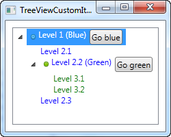 I did a whole bunch of things here, just to show you the kind of flexibility you get: I colored the child items and I added images and even buttons to the parent items. Because we're defining the entire thing with simple markup, you can do almost anything, but as you can see from the example code, it does come with a price: Huge amounts of XAML code, for a tree with just six nodes in total!