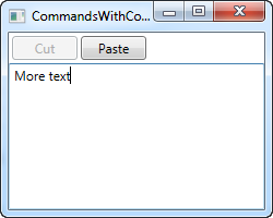 WPF hace esto manejando los eventos Executed y CanExecute por ti, cuando un control de entrada de texto como el Textbox tiene el foco. Eres libre de saltarte estos eventos, los cual es básicamente lo que hicimos en el ejemplo anterior, pero si solo quieres el comportamiento básico, puedes dejar que WPF conecte los commandos y el control TextBox para que hagan el trabajo por ti. Solo mira que tan simple es este ejemplo: