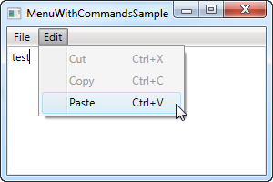 Potrebbe non essere del tutto ovvio, ma usando i comandi, abbiamo solo un sacco di cose gratis: scorciatoie da tastiera, testo e InputGestureText sugli elementi ecd inoltre WPF abilita/disabilita automaticamente gli elementi in base al controllo attivo e il suo stato. In questo caso, Cut e Copy sono disabilitati perché non è selezionato alcun testo, ma Paste è abilitato, perché i miei appunti non sono vuoti!