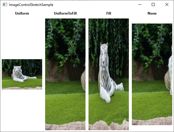 </Window>Het valt misschien moeilijk uit te leggen, maar alle vier de Image controls laten dezelfde afbeelding zien, maar met verschillende waarden voor de Stretch property. Hier is hoe de verschillende manieren werken: