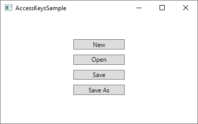 <Button Content="_New"></Button>Observați sublinierea (_) chiar înainte de caracterul N - aceasta va transforma tasta N în cheia de acces desemnată pentru acest control de tip buton. În mod implicit, aspectul controalelor dvs. nu se schimbă, după cum puteți vedea din acest exemplu în care am definit Chei de Acces pentru toate butoanele: