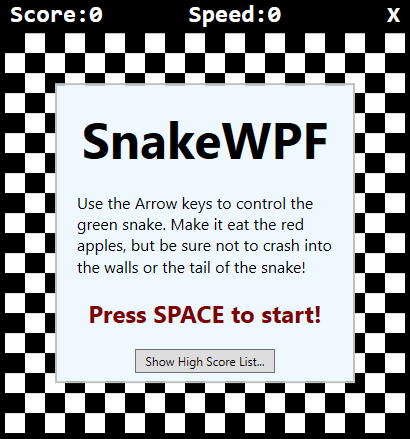 In the previous article, we made a lot of visual improvements to our SnakeWPF implementation. In this article, I would like to add a very cool feature: A high score list! On top of that, I would like to make the game a bit more user-friendly, by adding a welcome screen. I'll also be replacing the very non-gamey "You died"-messagebox with an in-game screen.