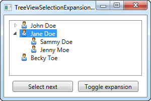 The most interesting part happens when I set the IsExpanded and IsSelected properties on the person2 object. This is what causes the second person (Jane Doe) to be initially selected and expanded, as shown on the screenshot. We also use these two properties on the Person objects (inherited from the TreeViewItemBase class) in the event handlers for the two test buttons (please bear in mind that, to keep the code as small and simple as possible, the selection button only works for the top level items).